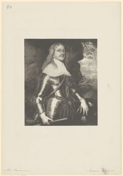 Editor: This is Johann August Eduard Mandel's portrait of "Carl I, König von England." The sharp contrast in the etching gives it a regal yet somber air. What formal elements stand out to you? Curator: The meticulous rendering of texture, especially in the lace collar and velvet cloak, commands attention. Note how the artist uses hatching and cross-hatching to create a sense of depth and volume. Do you observe the subtle shifts in tonality? Editor: Yes, it's incredibly detailed! The way the light catches the fabric is quite striking. I wonder if the artist used a specific technique to achieve such fine lines. Curator: Precisely. The formal rigor suggests the artist aimed to elevate the sitter through technical virtuosity. Notice how the composition emphasizes line over color, reinforcing the subject's status. Editor: I see what you mean. I hadn't thought about how the lack of color contributes to the overall effect. Curator: Considering the composition, tonality and textures, what do you make of the artist's choices now? Editor: Now I understand how each compositional element contributes to a powerful statement. Thank you.