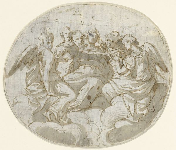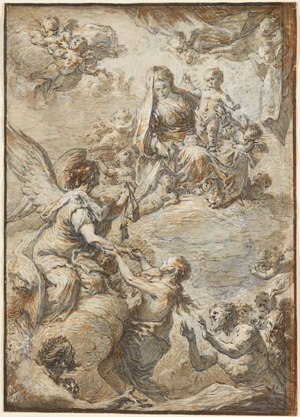 Belisario Corenzio made this drawing, Saint Peter and the Angels Receiving a Soul in Paradise, with pen and brown ink, brush and grey wash, heightened with white on grey paper. The drawing's layered application of ink and wash creates depth and atmosphere, appropriate for a heavenly scene. Corenzio’s technique is rooted in the traditions of workshop practice, where the manipulation of materials would have been a daily activity. Corenzio, who was born in Greece, established himself as one of the leading painters in Naples. Drawings like this one were produced in preparation for larger paintings, as a means of working out compositional ideas. They were crucial in the design of altarpieces and frescoes, which served as powerful tools of religious instruction, reinforcing the power of the church. Looking at the drawing from the perspective of material and making allows us to connect it to the broader social and cultural contexts of artistic production in Corenzio’s time, and to appreciate the intense labor involved in its creation.
