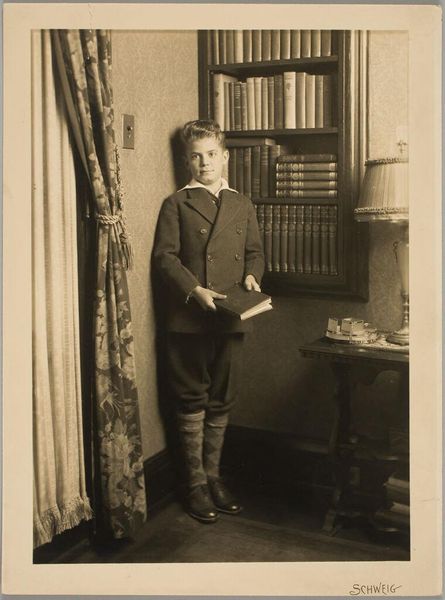 Editor: Here we have Augusta Curiel's "Portret van Aleidus Coenen, componist," possibly created between 1907 and 1925, a gelatin-silver print photograph. The composer strikes a rather nonchalant pose beside his piano. How do you interpret this work, particularly given Curiel's identity as a female photographer in Paramaribo? Curator: It’s essential to situate Curiel’s work within the historical context of colonial Suriname. As a woman photographer of Afro-Surinamese descent, her gaze carries a specific weight. The very act of documenting Coenen, a composer likely belonging to the European-descended elite, becomes a powerful assertion of her own agency and a subtle commentary on class and representation. Editor: I hadn't thought about it that way. It felt like a fairly straightforward portrait at first glance, but you are right: Curiel's positioning within that society adds a layer of complexity. Is the stylistic choice of pictorialism relevant here as well? Curator: Absolutely. Pictorialism, with its emphasis on artistic effect, allowed photographers like Curiel to elevate their work beyond mere documentation. By employing soft focus and evocative lighting, she's not just capturing an image; she's crafting a narrative. The presence of the bust in the background further elevates Coenen to almost iconic status, fitting in with existing visual culture. Consider, also, who was missing from the visual culture and how Curiel attempted to reconcile and revise that imbalance through her own portraits. Who gets remembered, and by whom? Editor: So, the portrait becomes an act of both recording and re-writing social hierarchies, a very conscious choice of how to visualize power and creativity? Curator: Precisely. It prompts us to consider how photography, especially in a colonial context, becomes a tool for shaping perceptions and challenging existing power dynamics. Curiel's work acts as a critical intervention within that historical landscape, a point of departure. Editor: I see this work in a new light now! Thank you for highlighting Curiel’s powerful stance as an artist navigating social inequalities through portraiture. Curator: My pleasure. Keep questioning, and keep connecting art to the world around it.