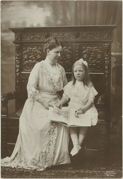Curator: This is a gelatin-silver print by Herman Deutmann, dating from 1920. It is titled "Portret van Emma, koningin-regentes der Nederlanden, en Juliana, koningin der Nederlanden", which translates to "Portrait of Emma, Queen Regent of the Netherlands, and Juliana, Queen of the Netherlands." Editor: It projects an air of maternal warmth and dynastic continuity. The grayscale softens the scene, but I find myself drawn to the almost stern composure of the older woman versus the younger woman holding a book in her small hands. Curator: Considering the materiality, gelatin-silver prints like this one became incredibly popular in the late 19th and early 20th centuries for their tonal range and relative ease of production. This image wouldn't exist without significant developments in industrial chemistry and the mass production of photographic materials. And consider what that mass reproducibility did for the royal family! Editor: Absolutely, but the composition is doing a lot of work as well. Note the carefully constructed symbolism here: the book young Juliana holds, suggestive of learning and inheriting knowledge. The older queen’s stern face is in sharp contrast to the young princess who looks right back at the camera. Curator: This photo is undeniably staged, but that doesn't make it inauthentic. Rather it is work: think of the labor and capital that went into clothing and providing for these sitters so that they could create an image of royalty. This image is meant to reassure its audience during times of global shift. Editor: I am struck by how it represents not just a family portrait but the embodiment of a nation’s hope for the future through the symbolic passing of a torch. The eye is always drawn to the little Queen! Curator: It's easy to get lost in those symbolic readings but this photo couldn't exist without technological innovation in a factory, workers, darkrooms, gelatin! Editor: Perhaps but beyond its industrial origins, this photo immortalizes figures poised between tradition and a rapidly changing world. I see cultural endurance represented. Curator: And I appreciate seeing the convergence of industrial development and labor put towards the construction of monarchy and class! Editor: Indeed! These two seemingly contrasting aspects—materiality and symbolism—weave together to give this work a profound presence.