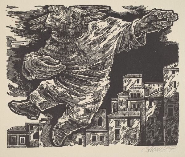 Editor: This is Ernst Ludwig Kirchner’s "Railroad Station, Konigstein im Taunus." It’s a woodcut, so the contrast is intense. It feels almost…claustrophobic, despite depicting an outdoor scene. What historical context might shed light on this feeling? Curator: Consider Kirchner's involvement with Die Brücke, a group challenging academic art traditions and grappling with rapid industrialization. This print seems to capture the anxieties of modern life, doesn't it? The crowded composition and sharp angles could reflect a sense of social unease and the loss of traditional values. Editor: So, it's not just a landscape; it's a commentary on the societal impact of progress? Curator: Exactly. Think about the role of the railway – connecting people, yet also potentially alienating them. The artist seems to be asking: Is this progress truly beneficial, or does it come at a cost? Editor: That makes me see the entire piece differently. It’s powerful how art can reflect such anxieties. Curator: Indeed. By understanding the historical context, we can appreciate how art engages with the socio-political landscape of its time.