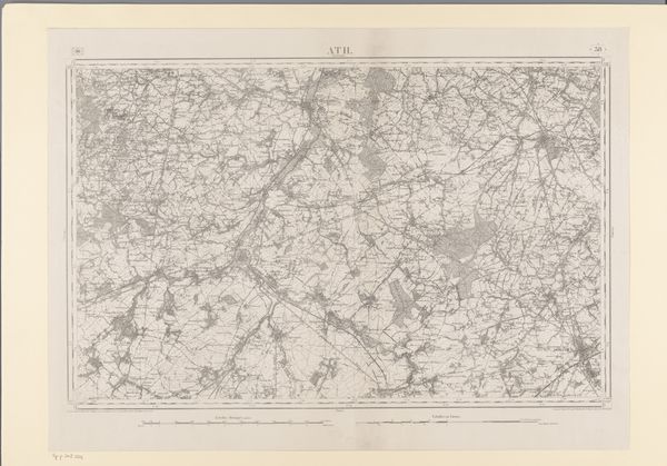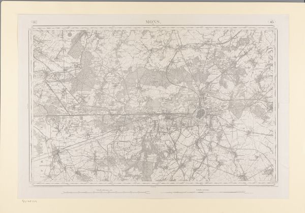 Curator: Here we have a lithograph titled "Kaart van de omgeving van Leuven," or "Map of the Leuven Area," created around 1871 by diverse manufacturers. Editor: Wow, what a beautifully intricate web! My first thought is it reminds me of neural pathways. The way all the roads and districts seem to be branching out—it’s captivating. Curator: That's a compelling interpretation. I’m interested in this map because it allows us to visualize urban development during a period of significant political and social change in Belgium. The level of detail provides a glimpse into the area's infrastructure, land use, and how communities were connected – or, perhaps, disconnected – during this era. Editor: It does spark thoughts of access and privilege. Who gets to travel those well-worn paths and who remains confined to a smaller portion of the map? What stories hide within those pockets? And the forests—they seem like separate worlds altogether, full of mystery. I feel a longing to explore them! Curator: Indeed. Note the scale of the forested areas. Consider the politics of land ownership and resource control at the time, who benefited from access to those resources, and who might have been excluded. Editor: That's a somber reminder. Thinking about maps, it's easy to fall into the trap of seeing them as objective representations, forgetting about the power dynamics that inform their creation. I bet the cartographers had specific priorities in mind, reflecting societal values and structures, consciously or not. Curator: Precisely. Maps are not neutral. They are inherently ideological artifacts. Examining elements such as the chosen projections, the level of detail afforded to certain regions versus others, and even the language used, all offer clues to the mapmaker's perspective and the societal norms they represent. Editor: I see so much now, where initially I only appreciated it for its intricate, mesmerizing quality. It really hits me that every line represents a deliberate decision, a way of shaping understanding. A bit humbling, actually! Curator: Exactly. Engaging with such pieces demands critical inquiry, acknowledging that artworks like this are shaped by political contexts. It provokes an understanding of societal values and intersectional implications that stretch into our present reality. Editor: Thank you. Now, seeing this as more than a beautiful map – recognizing it as a constructed viewpoint, really opens the mind, and the heart, to bigger questions.