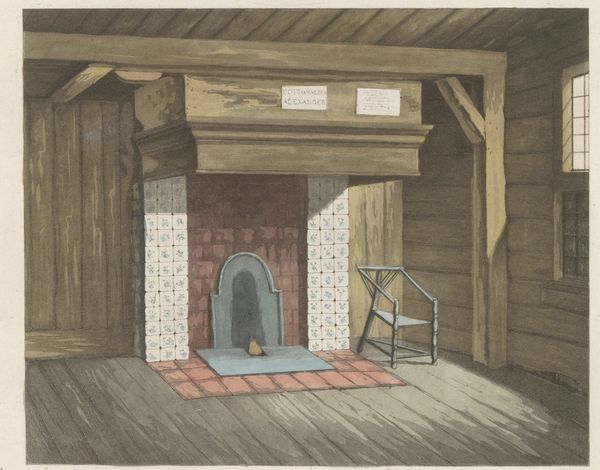 Editor: So this is "Tower chamber of Yaroslavna" by Nicholas Roerich, created in 1914 using watercolor and colored pencil. It’s interesting, almost like a stage set with that sharply receding perspective. What immediately strikes me is the emphasis on interior architecture and the wood graining. What catches your eye, Professor? Curator: Initially, it’s the treatment of space. Note how the artist manipulates perspective to flatten the composition. The orthogonals of the floorboards do converge, yes, but the window, and its framing decorative woodwork, are treated frontally, emphasizing the picture plane rather than creating a deep recession. Does this tension between flatness and depth resonate with you? Editor: Absolutely. It feels very deliberate. I was also wondering about the texture created by the colored pencil and watercolor. It's not trying to hide the materials at all, which I find interesting. Curator: Indeed. Observe how Roerich leverages the inherent qualities of his media. The grain of the colored pencil isn’t disguised; it's celebrated, creating texture and emphasizing the materiality of the wooden structure. This resonates with the Symbolist movement's interest in surface and the power of the visual elements themselves. Do you notice any other compositional devices employed to emphasize the architectural forms? Editor: I think the way the light is handled is significant. The even illumination almost makes it feel like a diagram, rather than a realistic space with shadows. And the view in the window provides contrast. Curator: Precisely. The even light flattens the form while accentuating the texture, almost removing all traces of volume. The choice to present the stylized, graphic cityscape through the window brings forward/creates another type of picture within a picture—one set back into an alternate spatial setting/scheme altogether. Are you also attuned to that lone figure there, just off to one side? It’s intriguing. Editor: I agree! It is striking that she is facing *away* from the picture's window and implied light source, which serves to isolate the character and imply longing or despair, a potential interpretation based on the symbolic architectural confinement on view in this Russian Avant-Garde-ish work. Curator: A nuanced and astute assessment; one that helps further bring to light/further shed light/illuminate this symbolic narrative and this interior scene’s intrinsic structure as well. Editor: Thanks, this discussion has helped me appreciate the work beyond my first impression, particularly how the form supports potential symbolism!