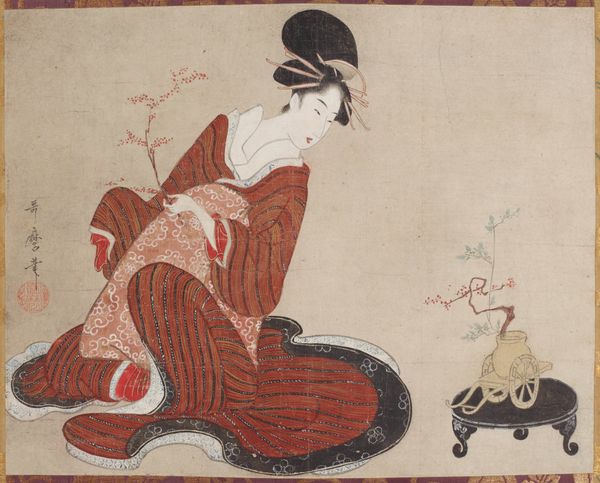 Nishikawa Sukenobu created this image of a courtesan with a kitten sometime in the first half of the 18th century, using ink and color on silk. It shows a high-ranking courtesan in a moment of leisure, seated next to a shamisen and a tea set. In the Edo period, when this image was made, the Yoshiwara district in Japan was home to many courtesans who were often the subject of popular art. These women were entertainers, skilled in conversation, music, and dance and, because they were style-setters, their portraits record the fashions of the time. Woodblock prints and paintings of courtesans were extremely popular with the merchant class, who had the wealth to enjoy the pleasure quarters. This painting isn’t just a pretty picture, however; the way the subject is posed reflects the highly controlled world that these women lived in. Courtisans were expected to embody ideals of beauty and refinement and this painting captures the way they had to perform for the male gaze. To better understand these images, social historians often turn to sources like diaries, literature, and government records. These resources help us to look beyond the surface beauty of these images and explore the complex social and institutional structures that shaped them.
