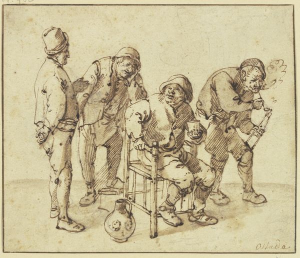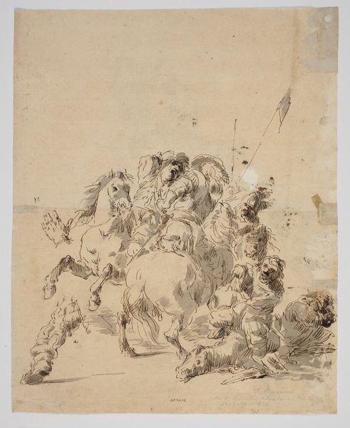 Giovanni Battista Piranesi created this sheet of sketches, Six Figures, with pen and brown ink wash, sometime in the 18th century. The composition divides the figures in the picture plane, creating an active rhythm with the alternation of forms across the horizontal axis. Piranesi's use of hatching and cross-hatching is quite evident in his construction of volumes. The marks are not just descriptive but are expressive, suggesting movement and the fleeting nature of the sketch. Notice, in particular, how the artist uses a range of tonal variations, from light to dark, to describe the drapery and anatomy of the figures. Considered within the context of Enlightenment thought, Piranesi's approach to sketching may be seen as an exploration of perception and the representation of reality. The sketch format allowed artists to engage directly with the visual world. It’s an invitation to consider the fluid nature of meaning, and to appreciate the sketch as a site of experimentation, where ideas are formed and reformed in real time.
