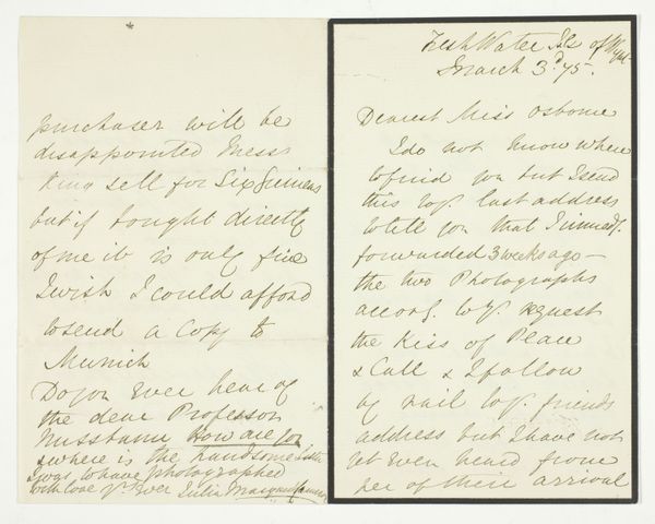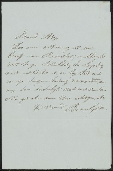 Curator: Right, let’s look at this interesting piece. It’s titled "Briefkaart aan R.W.P. de Vries Jr.," or Postcard to R.W.P. de Vries Jr., possibly from 1931, made with ink on paper. Editor: My first thought? A little peek into someone's life. It feels incredibly intimate, doesn’t it? Like stumbling across a forgotten letter in a dusty attic. The handwriting just adds to that sense of closeness. Curator: Precisely! It's a portrait in words, capturing the zeitgeist and cultural milieu of the time, but I guess there are some challenges for its legibility and translation nowadays. You know that it shows script typography, hand-lettering, aged paper and stylised text! Editor: True, it is a dense script and those dark-yellowish aged tints create an illusion that the script blends in to background; so even if there were many artistic aspects embedded here it can only trigger negative and slightly disturbing feelings because, visually speaking, it feels like you need some effort and strain in order to look at it. Curator: As an artistic exercise, I wonder: Can this be interpreted as something we should really consider? Is there some sort of cultural resistance? Is that a statement? Because, if not, is all down to something not visually attractive? Editor: Interesting question! Perhaps its beauty lies precisely in that challenge? The act of deciphering, the historical curiosity it awakens. Maybe it challenges our fast-paced digital consumption, inviting a slower, more thoughtful interaction. What is certain is that there are some challenges for us modern users to embrace, in some way, a work like this. Curator: I agree completely! A portal into the past, with many doors to other thoughts to the modern beholder. It is what is beautiful about art! Editor: Indeed! Well, thank you for this conversation! That makes me ponder the role of communication as art.