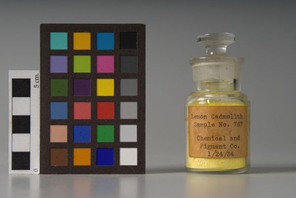 Curator: This is “Medium Chrome Yellow,” a pigment sample manufactured by Ansbacher-Siegle Corp. Editor: The vivid yellow inside that glass jar is arresting. It's like bottled sunshine next to that muted color chart. Curator: Indeed, and this object highlights the fascinating intersection of industry and art. Ansbacher-Siegle, located on Staten Island, produced this in 1941. Think about the socio-political context of that era. Editor: Right. It's not just a color; it’s a product of a specific time and place, reflecting the industrial capabilities and the visual culture being cultivated. Who had access to this yellow, and what did they create? Curator: Precisely. The label itself becomes a historical document, hinting at the forces shaping artistic expression. The very existence of the pigment points to larger systems of production and consumption. Editor: Seeing them together like this--the purity of the pigment against the spectrum of possibility--makes you wonder about intention, application, and the stories behind each shade. Curator: And that is how a simple pigment sample invites us to delve into the complex narratives of its time. Editor: An unexpectedly moving encounter with the past.