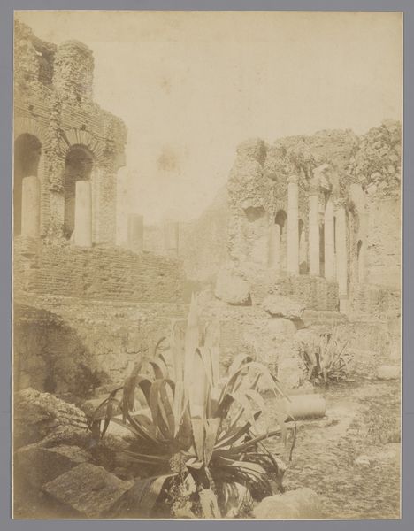 Curator: What a wonderfully evocative albumen print. This photograph, taken between 1880 and 1900, captures the "Remnants of the Baths of Taormina, Italy," as seen by the lens of Ledru Mauro. Editor: Immediately, I’m struck by the monochrome tonality; a subtle gradation creating a hazy dreamscape. It’s a picture filled with texture and light. Curator: It's quite intriguing how Mauro juxtaposes the enduring presence of the ancient Roman ruins against the then-contemporary fascination with landscape photography and the Grand Tour. The albumen printing process, popular during this period, allowed for mass production and dissemination of these views, making ancient sites like Taormina accessible to a wider audience. Editor: True, but let’s not overlook the pure form. The rigid verticality of the remaining columns contrasting with the rough, eroded stone. And see how those two figures, perhaps tourists, become integral compositional elements. They aren’t merely incidental, but human scales defining the monumentality of the architecture. Curator: I see your point. Consider also the social dynamics at play here. Tourism fueled a market for these images. Photography as a business gave individuals like Mauro agency, affording them a means of production, and allowing them a role in shaping the narratives we continue to have about ancient history and antiquity today. Editor: It also directs our attention to materiality itself; the image becomes an artifact mirroring the antiquity it represents. The surface texture of the albumen print parallels the aged textures within the depicted ruins, merging the ancient world and its modern visual representation. Curator: So you’re drawn to how this photograph underscores not just a location but also highlights the commodification and consumption of history, mediated through both the Grand Tour and photographic reproducibility. Editor: Precisely! The formal components, the texture, light, figures, reinforce this intersection of temporality, revealing an awareness of our gaze through shifting layers of perception and history. Curator: That is a brilliant perspective. It’s interesting to consider how a seemingly straightforward architectural study becomes so dense with multiple historical and artistic layers through our combined views. Editor: Indeed. A fleeting moment in time, captured and preserved, continually inviting deeper interpretation.