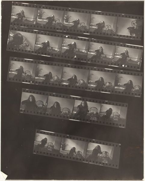 Curator: Here we have Robert Frank’s “Painters no number”, a contact print made circa 1950s. Editor: The repetition of images along the film strip gives it a rhythmic quality. I can sense an aura of mid-century bohemian life; a very cool kind of restlessness comes to mind. Curator: Let’s consider the composition. Frank’s use of the entire film strip—complete with frame edges and visible numbers—disrupts traditional photographic presentation. It acknowledges the raw, material process of image-making. The arrangement emphasizes the inherent sequentiality of photography and cinematic form. Editor: Precisely! Each row presents a potential narrative, but instead, we get a grid, frustrating conventional expectations for photographic truth. The artists—mostly women, I think—appear isolated within their creative labor. Think about gendered labor at mid-century. Frank captured a period where women were navigating constraints both within the art world and society. This print really opens to think about work and subjectivity. Curator: The grainy, high-contrast aesthetic also flattens the picture, reducing tonal subtlety in favor of graphic impact. These stylistic decisions create a very particular feeling. There is an appealing ambiguity arising from these portraits’ sequential, yet disconnected format, drawing our eye into its textural features. Editor: It's fascinating how this format anticipates so much that is at play within contemporary photography! This "unorthodox" presentation highlights how photographic representation mediates between individual experience and collective identity, particularly for artists outside the mainstream. What do you take away from Frank's experimental take on portraiture? Curator: A compelling visual testament to the processes behind making art. Frank exposes the usually unseen aspects. Editor: I agree; it's the intimacy of creative labor—reproduced across many frames, that intrigues me the most. A candid series of revealing moments that hint to the gender dynamics in mid-century artistic professions.