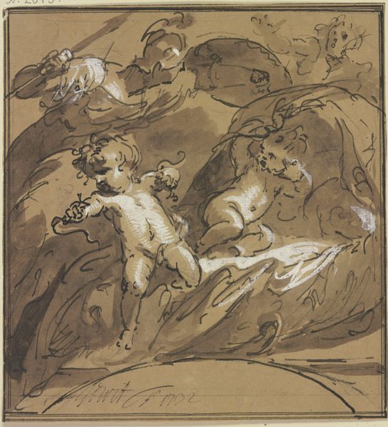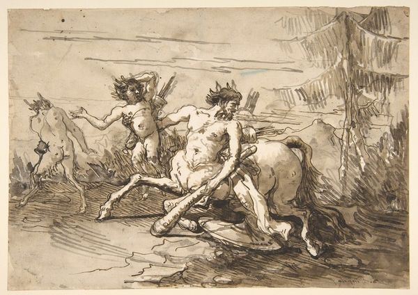 Abraham van Diepenbeeck created this drawing, Hercules verslaat Acheloüs in de gedaante van een stier, using pen in brown and gray ink. The composition is dominated by the struggle between Hercules and the bull, Acheloüs, rendered with dynamic lines and a strong sense of movement. Notice how the artist used hatching and cross-hatching to create depth and volume, particularly in the figures of Hercules and the bull. This technique emphasizes their musculature and the tension of their struggle. Diepenbeeck seems to emphasize form and structure over explicit narrative. The architectural backdrop and the onlookers are secondary. Hercules's triumph over Acheloüs symbolizes order overcoming chaos. The drawing becomes a meditation on power, transformation, and the imposition of human will. The very act of drawing, with its lines defining form and space, mirrors this imposition of order. Through these formal choices, the artwork invites us to consider the underlying structures of myth. It prompts questions about how we interpret narratives, and how the artist’s formal techniques contribute to the construction of meaning.