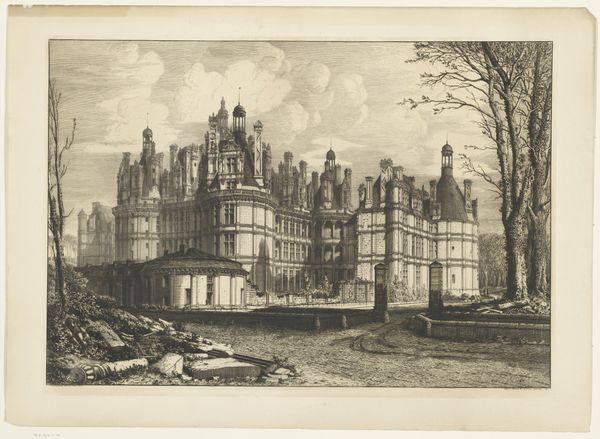 Léon Auguste Asselineau captured the Château de Chambord in this print. Look at how it towers over the landscape—a grand display of French Renaissance ambition. The castle, with its many chimneys and elaborate roofline, is more than just architecture; it’s a statement. Like the Tower of Babel, this castle reaches for the heavens, symbolizing human aspiration and perhaps even a touch of hubris. We see echoes of this reaching gesture in gothic cathedrals and even modern skyscrapers, all striving to impress and inspire awe. But consider the figures in the foreground, peasants working the land. Their presence brings a psychological tension to the scene, contrasting the opulence of the castle with the everyday struggles of the common folk. This juxtaposition is not just a visual trick; it’s a recurring theme throughout history. Think of the pyramids of Egypt looming over the fields of its enslaved builders. These images speak to our collective memory of power, labor, and the enduring human condition. The castle remains, but its meaning shifts, colored by time and context.
