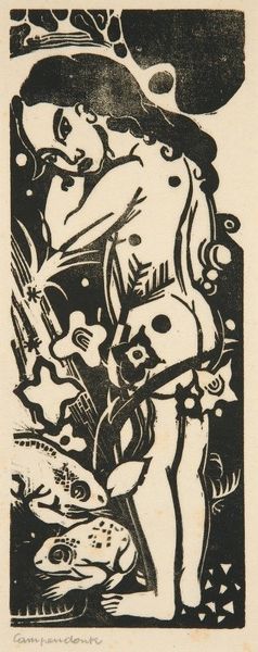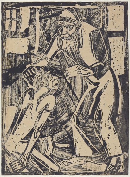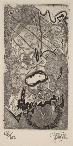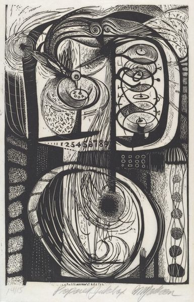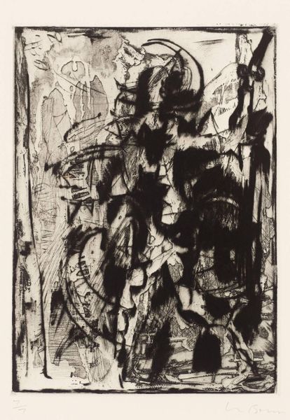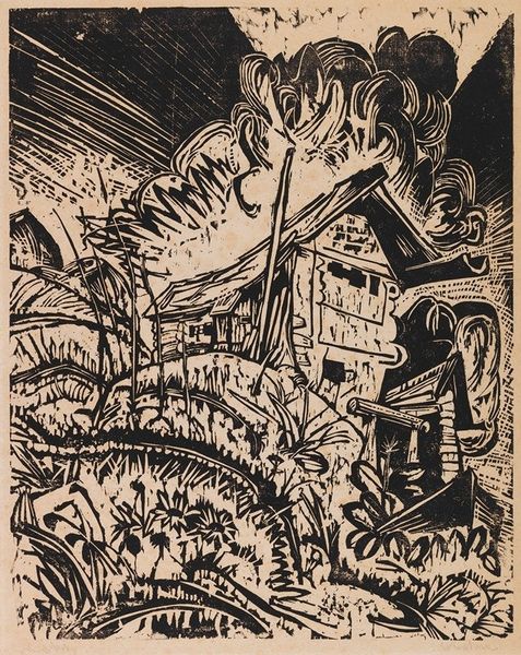 Franklin Chenault Watkins created this work, titled "And Into the Deep, Blue Sea," using woodcut. The stark contrast between black and white immediately grabs your attention. The dynamic composition features a figure on horseback amidst a dense forest or perhaps a turbulent sea. Notice how the artist uses bold, angular lines to define the forms. The starkness of the woodcut technique intensifies the drama of the scene. Watkins employs a high degree of abstraction to communicate powerful sensations. The composition destabilizes the conventional perception. The dense marks, rather than describing a specific landscape, evoke a psychological space where fear, uncertainty, and the sublime intertwine. Look closely at how Watkins challenges fixed meanings through the use of abstraction. The horse and rider are not depicted realistically but are instead rendered as fragmented forms. This disrupts traditional notions of representation and invites us to engage with the artwork on a more conceptual level.