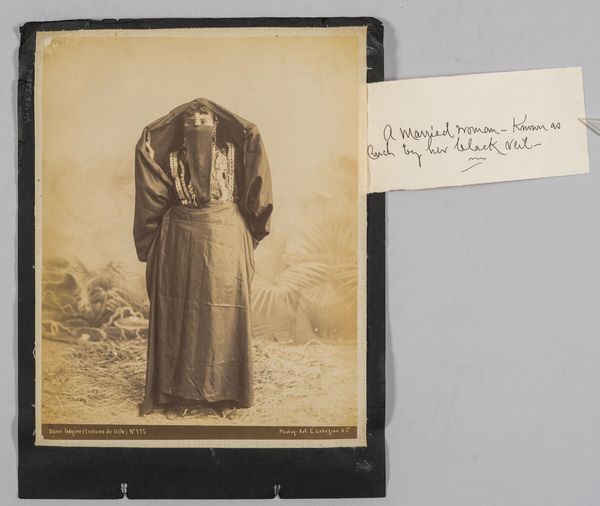 Curator: This is an albumen print by Félix Bonfils, a 19th-century photographer. It features two women in traditional dress, each carrying a child. Editor: There's a striking sense of weight here, not just physical but also emotional. The sepia tones lend it an air of antiquity, but the figures themselves feel very present. Curator: Bonfils's process involved coating paper with albumen, derived from egg whites, to create a smooth surface for the photographic emulsion. It’s fascinating how these materials can transform light into a durable image, documenting a moment in time. Editor: The veils, and the way they obscure the women's faces, evoke ideas of mystery and cultural identity. But the children also represent vulnerability and hope. Curator: Indeed. The production of such photographs also speaks to the colonial context of the time, raising questions about representation and the photographer's gaze. Editor: Ultimately, it's a powerful image that lingers in the mind, prompting reflection on the complexities of motherhood, culture, and the passage of time. Curator: It certainly gives one much to consider regarding the materiality of representation, wouldn't you agree?