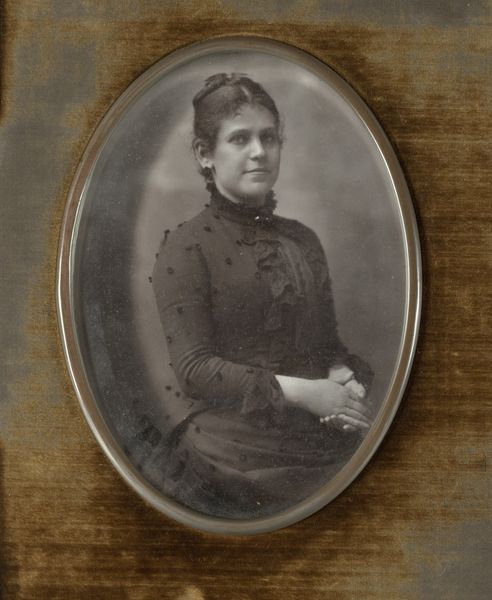 Curator: Right, so, this is a photographic portrait, believed to be created by Theodor Bässler sometime between 1860 and 1900. The artwork, known as "Portret van een jonge vrouw met halsketting"—that's "Portrait of a Young Woman with Necklace" to you and me— showcases an oval sepia print of a young woman. Editor: My first thought is one of melancholy, I'd say the overall tone is a soft yet insistent sadness. Something about her direct gaze combined with the faded quality of the photograph evokes a profound sense of nostalgia for a time and person I've never known. Curator: Interesting. I see a certain strength in that gaze too. The simplicity of the composition, almost clinical in its realism, serves to highlight the individual. And those details, like the frilled neckline and the delicate pearls...they feel very telling. Editor: Oh, absolutely, and those details speak volumes about social standing and perhaps the restrictions placed upon women of her era. We’re talking about a time steeped in Victorian ideals. Those pearls aren’t just an accessory, they're a marker. A carefully curated symbol. Curator: Right. Photography at this time was gaining prominence, becoming increasingly accessible, which opened up portraiture to the rising middle class. Suddenly, you didn’t have to be nobility to have your likeness captured. Do you think there’s anything radical about how she's portrayed? Editor: Radical? Perhaps not overtly. However, the very act of a woman existing in the public sphere—even through a photograph—could be seen as a subtle act of defiance against the Victorian expectations of domesticity and subservience. It’s a form of claiming space and visibility. It says: "I am here, I exist." Curator: It's strange how, through something as ostensibly simple as a portrait, one can catch glimpses of rebellion and constraint coexisting, isn't it? The formal pose, the restrained clothing... yet that defiant gaze pierces through it all. It's the tension between the presentation and what lies beneath that fascinates. Editor: Absolutely, and perhaps it's that very tension—the push and pull between societal expectations and individual identity—that allows this seemingly simple portrait to speak so powerfully to us across the ages. It resonates even now, in an era of filtered selfies, as an assertion of presence in the face of often oppressive expectations.