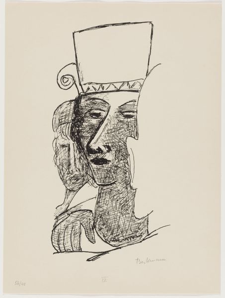 Editor: This is Max Beckmann's "Dancing Couple." It's a stark ink drawing with a somber mood. What do you make of the figures' relationship, and Beckmann's choices here? Curator: Beckmann, living through immense social upheaval, often depicted alienation. Notice how the figures, though physically close, are emotionally distant, almost trapped. Consider too the rigid lines; they speak to the constraints placed upon individuals, particularly during times of political turmoil and societal reconstruction. What narrative do you think he's hinting at? Editor: I guess it's about power dynamics? The taller figure seems dominant. Curator: Precisely. Beckmann subtly critiques how power imbalances and social structures affect intimacy and personal expression. So, while named "Dancing Couple", this is a reflection on the anxieties of a generation. Editor: It’s unsettling, but so insightful. I'll never look at a simple title the same way.