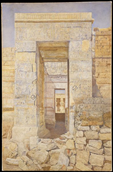 Curator: Joseph Smith invites us to step through the "Temple Gateway at Medinet Habu, Thebes," in this canvas at the Harvard Art Museums. Editor: It feels wonderfully…sturdy, yet faded. The gateway dominates, but that peek of hazy landscape beyond softens the whole thing. Curator: I think the composition directs our gaze so deliberately; the pillars act as visual anchors framing the vista. How do you feel about the materiality here? Editor: The paint has a dry, almost sun-baked quality. It's a study in ochre, really, with little flecks of turquoise and umber adding depth. Curator: Smith captures a sense of timelessness, the weight of history literally etched into the stone. I can almost feel the scorching heat and see echoes of the past. Editor: It's almost like a stage, isn't it? A threshold between worlds. Gazing at this image, I feel like I'm standing on the precipice of somewhere ancient and profound. Curator: Precisely! It is as though Joseph Smith wanted to show us not just a building, but also its haunting atmosphere.