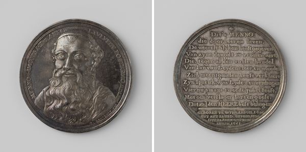Curator: Today, we are observing a bronze relief currently held at the Rijksmuseum titled "Herbouw van de afgebrande Nieuwe Luthersche kerk te Amsterdam," dating back to 1826. Editor: My immediate impression is one of muted solemnity; the color is austere, almost grave. Is it meant to evoke a memorial tone? Curator: Functionally, as a relief in bronze, this piece exists both as commemorative object and as small-scale history painting cast for a wider audience. I think that’s what strikes one so profoundly. The portrait bust is handled masterfully, recalling certain neoclassical idioms of the time. Editor: Neoclassical, but the material is itself intriguing. Why bronze? Its durability speaks volumes about intended longevity. The texture, too; was it cast in one piece, or were there separate molds involved? And, beyond technique, what narratives were enabled, or perhaps, occluded through that material selection? Was it commissioned by the church itself, or by civic authorities, and what implications does this provenance hold for how we interpret its content and intent? Curator: Those are very incisive points! The choice of bronze certainly lends a sense of timelessness to what is essentially a depiction of a singular historical moment. Editor: And the inscription… How was it produced? Curator: Presumably also part of the casting process, lending a unity of form and content to the piece. Notice the symmetry inherent in its construction. I see that same intentional structure repeated throughout. It almost abstracts the specific event into a kind of formal pronouncement about faith and perseverance. Editor: Exactly! Its deliberate construction points towards the social and historical context that enabled it. These kinds of details enrich its narrative possibilities beyond the surface memorial function. Curator: Absolutely. In closing, this bronze relief transcends its immediate historical context to embody broader themes of resilience and historical commemoration, offering insight into both individual faith and collective endeavor. Editor: Indeed, it’s in examining the materials, the making, and the socio-political frameworks that gave shape to objects such as this where the object truly reveals itself as testament and trace.