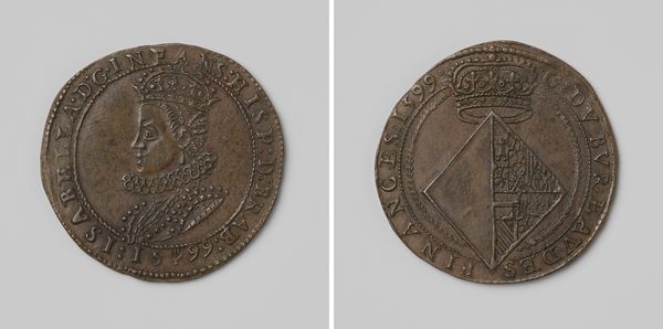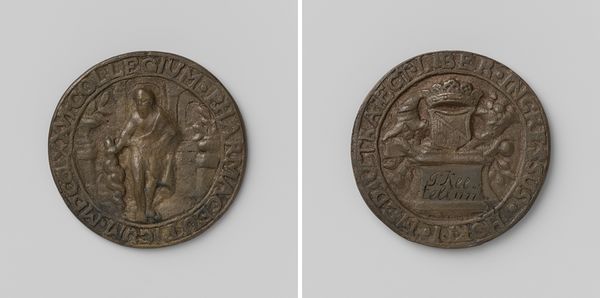 Editor: So, here we have "Collegium Medicum te Amsterdam, toegangspenning voor de hortus medicus van J. Steenmeyer," made of metal in 1803. It's an access token, almost like an ancient library card. I'm struck by how serious it looks – like a historical document compressed into a small disc. What do you see when you look at it? Curator: You've hit on something – that compression. It’s a world in miniature. I find myself drawn to the allegorical figures and the density of symbols they've packed in here. This isn't just a ticket; it's a statement about knowledge, health, and civic pride. Look at the figure with the snake – likely Asclepius, the Greek god of medicine – offering healing. Editor: It's like a classical scene shrunk down! Curator: Exactly! The Neoclassical style gives it this air of authority, doesn't it? That conscious harking back to a supposed golden age of reason and order. Makes you wonder what 'disorders' they thought they were ordering. What do you think of that, isn't interesting the way artists borrow to imbue themselves? Editor: It's fascinating – using the past to legitimize the present! The Amsterdam coat of arms is there, right? It's reinforcing civic authority, as you mentioned. Curator: Precisely. This token was their way of asserting that, while death knocks on every door, some are holding the gates. Editor: That puts the image in a whole new light, a small emblem of authority. I thought I saw a pretty disc but now it seems so powerful, almost magical! Curator: It speaks, in essence, of that persistent human hope against hopelessness. Now tell me – how would YOU secure this kind of symbolism for today's medicine, its images and concerns?