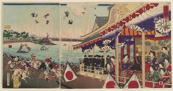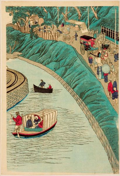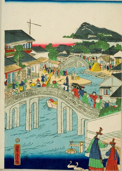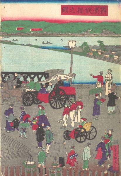 Curator: This print is titled "True View of the Foreign Buildings along the Kaigandori Seen from the Yokohama Wharves," by Utagawa Hiroshige III. Editor: My first thought? It's a fascinating blend. The figures are rendered with such distinct Japanese style, against a backdrop that feels like a watercolor dream of a European city. Curator: Indeed, the flags atop those buildings—likely representing various Western powers—are potent symbols of a rapidly changing Japan, opening to the world but also facing new pressures. Editor: There's almost a humorous element, though! The tiny horse pulling that oversized carriage, and the perspective feels...off, but charmingly so. It's like Hiroshige III is giving us his slightly skewed impression. Curator: Consider how the sea itself—those stylized waves—becomes almost a character in this drama, separating yet connecting these two worlds. It speaks to the liminal space Japan occupied during that era. Editor: I love the little dog. It's like a visual echo of the cultural blending: a familiar, comforting presence amidst all the newness. This piece feels surprisingly modern, like a commentary on globalization.