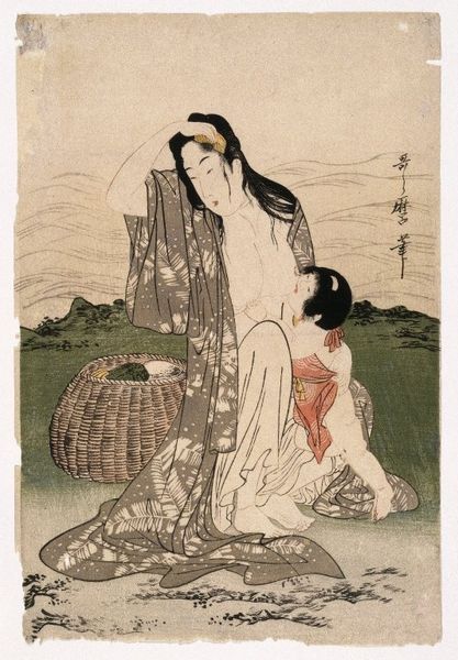 Editor: Here we have Muhammad Qasim’s "Lovers' Dalliance". The figures seem delicately posed, yet there's an interesting contrast between the smooth bodies and the somewhat rough landscape. What strikes you first about this piece? Curator: The composition is intriguing. Note how the artist uses the yellow drapery to guide the viewer’s eye across the reclining figure, connecting it to the kneeling one. Observe the interplay of line and form. What sort of structural relationships do you see? Editor: I see how the lines of the cloth create a diagonal that leads to the other figure. Curator: Precisely. Now consider how the artist contrasts the textures. The soft rendering of the bodies against the more stylized landscape elements creates a visual tension. What does this tension suggest to you? Editor: Maybe a contrast between intimacy and the outside world? I see a lot more now, thank you!