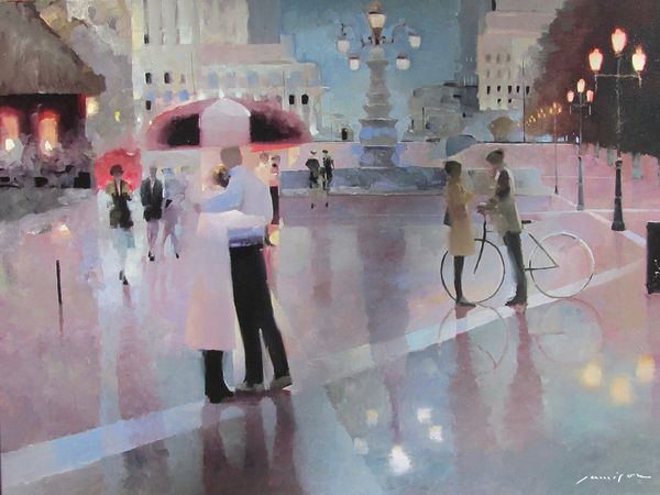 This is "Too Soon To Say" by Jeff Jamison. The artist captures a modern urban scene, focusing on figures amidst a wet cityscape, a place of reflection and movement. The umbrellas held by the figures are more than practical objects; they are symbols of protection and privacy, echoing the veils and canopies found in Renaissance paintings. The motif of water, seen in the rain-slicked streets, mirrors the symbolism of baptism and rebirth found in ancient Roman fountains and mosaics. The reflections distort the images and create a surreal emotional landscape, reminiscent of the psychological depths explored by artists like Edvard Munch. The urban space acts as a stage for these transient figures. These figures connect the ephemeral and fleeting nature of modern life, mirroring our collective subconscious.