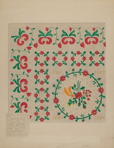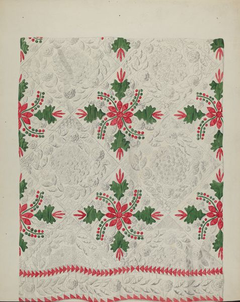 Editor: Here we have "Quilt," a mixed-media drawing on paper and textile from around 1936 by Therkel Anderson. It’s really striking how crisp and clean the floral pattern is; it almost feels like a blueprint. What's your take on it? Curator: I see it as a powerful commentary on the intersections of gender, labor, and artistic expression. Consider the historical context: quilt-making was often relegated to women, deemed "craft" rather than "art." Anderson's work challenges that hierarchy by elevating the quilt pattern to the level of fine art. What does the clean presentation evoke for you, thinking about its function as a *potential* quilt? Editor: I guess it takes away from the utility of the quilt and emphasizes the design itself, right? It's like extracting the artistic potential. Does this connect to anything beyond the immediate subject matter? Curator: Absolutely. The "Quilt" embodies the reclamation of domestic artistry as a legitimate form of creative production. During this time, women's creative works were often undervalued because of gender biases, especially textiles. Think about whose stories get told, whose work gets recognized. How might this image act as a form of resistance to traditional, patriarchal narratives within art history? Editor: So, it's about validating overlooked creative practices. By highlighting this quilt design, Anderson seems to be advocating for the recognition of these undervalued forms of art. Curator: Precisely. It prompts us to question the institutional structures that have historically marginalized certain voices and artistic forms and reflect on how design impacts women in both domestic and public life. Editor: This really makes you see this piece as much more than a pretty pattern! Curator: Exactly. It demonstrates the powerful potential for art to challenge, critique, and ultimately reshape societal norms and perspectives on design.