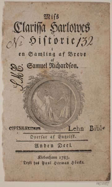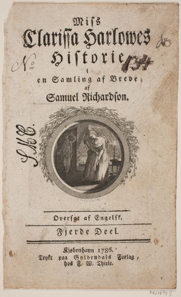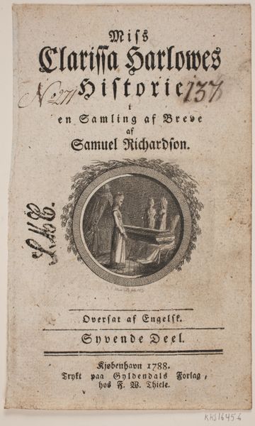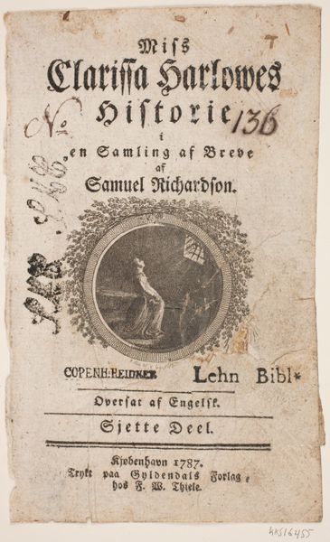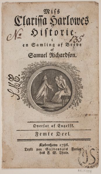 Editor: Here we have the title page for the third part of S. Richardson’s “Miss Clarissa Harlowe’s History,” engraved by Georg Christian Schule in 1783. The composition, with its vignette encased in an ornate border, seems quite formal and deliberate. What do you make of the visual arrangement here? Curator: Observe the deliberate stratification. Note how the text commands the upper register with a controlled typographical hierarchy. This directs the eye to the central vignette. A closer examination of the vignette reveals a controlled interplay of light and shadow defining the figures. The circular form acts as a compositional frame. How does that strike you? Editor: It makes me think about how much the framing defines the space of the image. And also I noticed how the characters within seem like they are almost on a stage. Curator: Precisely. The frame around the image dictates how the depicted content is viewed by a beholder external to the artwork itself. Moreover, let us note how the arrangement of light and figures leads us to appreciate the interplay between positive and negative space within the piece. Does it also influence your eye to see a dramatic rendering? Editor: It certainly does! The dark background really sets off the lighter figures, and it emphasizes that theatrical, stage-like quality. Thank you, I will consider that in the future! Curator: An understanding of these formal qualities offers invaluable means for appreciating art. I find exploring the interrelation of composition, light, and the manipulation of space to be quite fruitful.