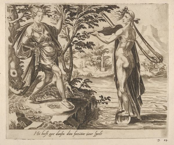 Curator: This engraving is titled "Patience as the Victor over Fortune from Six Sayings about Fortune," dating back to 1555-1565. It's currently held at the Metropolitan Museum of Art. The artist is Dirck Volckertsz Coornhert. Editor: Oh, my goodness, it’s...bleak. There's something profoundly melancholic about this composition. It almost feels like a commentary on the futility of striving, with a kind of dramatic resignation that you find when a juggler has just dropped a bunch of glass bowling pins. Curator: That feeling is understandable. Coornhert was deeply invested in the relationship between humans and their destinies. We see the allegorical figure of Patience, upright and rather solid looking, presiding over the defeated figure of Fortune. Fortune, who you might notice is naked and quite vulnerable, is lying prone. Her hand is resting upon a sphere, indicating her fickle nature. Editor: It's this sharp contrast that is so engaging. This assured Patience versus Fortune literally laid bare. Even the background with its ruined arches and obelisks amplifies the sense of inevitable decline, or maybe even failure. I wonder if the intention was for viewers to examine their resilience when the roulette ball comes to rest on somebody else's lucky number? Curator: Undoubtedly. Notice, too, how Patience is framed by symbols of constancy: a squared pillar, and the hint of a floriated urn above a broken bust that grounds her. Her serene posture and unwavering gaze invite the viewer to meditate on endurance and moral strength in the face of life's inevitable reversals. The symbolic wheel echoes this theme, recalling the vicissitudes of life's journeys. Editor: She has this expression like a schoolteacher that says "I tried to tell you things were going to come to this". Maybe I’m reading into it a little, but I find Coornhert has cleverly constructed a scenario we have all encountered. A goal once thought to be easily in grasp dashed cruelly before our eyes. In its desolation, a perverse type of humor shines through. Curator: Indeed. It's a stark reminder of the transience of worldly success and the virtues of inner fortitude. Coornhert really seems to capture something profound with this image, creating this emotional space of understanding between humanity and these greater concepts. Editor: This was more interesting and moving than I first assumed. The artwork is far more complex once you delve deeper, and what began as what I thought a bleak artwork transformed into something offering the fortitude for me to stand taller.