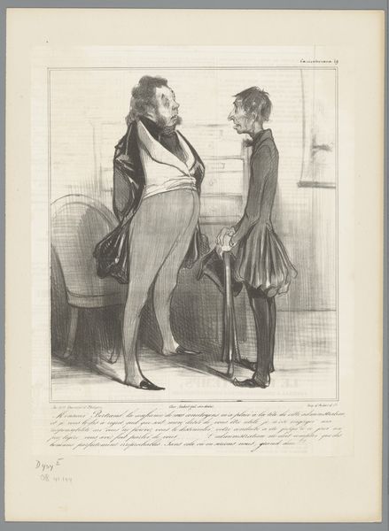 Honoré Daumier created this lithograph, titled "Réglement de comptes," which translates to "Settling Accounts," as part of his series "Robert Macaire." Published in the 19th century, Daumier uses satire to critique the bourgeoisie during a period of significant social and political change in France. Here, the artist depicts two figures who represent the wealthy class. Their exaggerated features and postures, alongside the text, mock their greed and corruption. The title suggests a financial transaction, possibly a shady deal, reflecting the artist's perception of the bourgeoisie as being morally bankrupt. Daumier uses caricature to amplify their negative traits, reducing them to symbols of economic exploitation. Daumier's work engages with the social issues of his time, offering a critical commentary on class divisions and economic inequality. The emotions evoked by the print are both humorous and biting. It invites us to reflect on power dynamics and the role of wealth in shaping societal values.