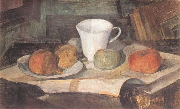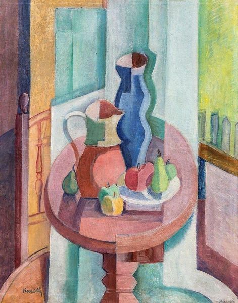 Kmetty János made this still life with oil paints, applied to a canvas support. The viscosity of the medium has clearly influenced his process. The thick paint allowed the artist to lay down shapes and colors with confidence, resulting in an interplay between the objects in the composition. The paint handling here is not illusionistic; Kmetty’s goal isn’t to replicate the appearance of the physical world, but to capture the essential forms and colors of the pitcher and fruit. This is not a photorealistic painting where the artist attempts to produce a perfect replica. The visible brushstrokes highlight the labor involved and also emphasize the importance of the artist's interpretation and expression, rather than mere replication. By embracing the materiality of oil paint and the act of painting, Kmetty elevates the still life beyond a simple depiction of objects, demonstrating that through materials and making, ordinary subjects can become vehicles for profound artistic expression.