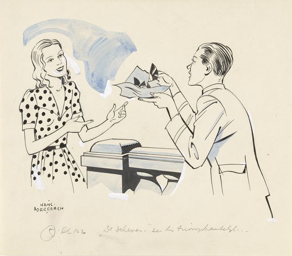 Hans Borrebach made this drawing of Freddy pointing at two men in a doorway with pen and ink. The washes of grey and blue are laid down so quickly that it feels like an annotation or sketch, like something dashed off in a notebook. Borrebach’s process feels quite intuitive; the quick, thin lines and washes build up the scene, capturing a sense of atmosphere and light with a sense of immediacy. Look at the man in the bowler hat, how the dark ink of his suit pools and bleeds, creating a sense of depth. The artist is not precious about it; he lets the ink do its thing, which gives the image a kind of casual elegance. The flat, unmodulated white of the paper gives the whole thing a strangely unfinished, almost dreamlike quality. There’s something about the graphic economy and focus on character that reminds me of George Grosz. Borrebach is brilliant in his own right, of course, offering us an ambiguous slice of interwar life. It feels very of its time, which is maybe why it still has the power to intrigue.