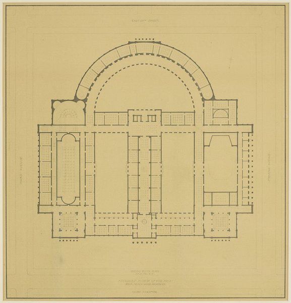 Editor: Here we have William Channing Whitney's "Main Floor Plan" from 1926, a drawing detailing the layout of the Minneapolis Institute of Art. The symmetry is immediately striking, almost imposing, but I'm curious about more than just the obvious architectural design. What do you see when you look at this piece? Curator: Immediately, my eye is drawn to the geometric precision. The linear quality of the draughtsmanship dictates the entire composition. Notice how Whitney employs a consistent line weight throughout, achieving a uniform texture across the plane. Observe how the 'new addition,' specifically, subtly departs from perfect symmetry; could you speak to its significance, vis-à-vis the plan as a whole? Editor: I hadn't focused on that. I suppose the addition slightly disrupts the balance, which creates visual interest. Maybe it reflects a more modern approach versus the existing structure? Curator: Precisely. Now consider the warm-toned paper. Its inherent materiality adds another layer. How do the angular lines juxtapose against the soft parchment, and to what effect? Editor: It’s an interesting tension, this precise geometry on something so organic, almost aged. Perhaps the paper serves as a reminder of the past, against which the plans for the future are sketched? Curator: A sound observation. The drawing is far more than a functional document; it is a record of intention that subtly questions itself, caught in the push-and-pull of structure and texture. Editor: Thank you for this perspective, recognizing the architectural form, its composition and material components, has certainly revealed depths I wouldn't have noticed by myself.