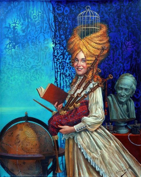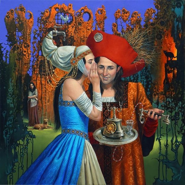 Curator: Michael Cheval’s “Imagine IV,” painted in 2019, truly stops you in your tracks, doesn’t it? A surreal orchestration unfolding before us in oil paint. Editor: My initial reaction is one of complete fabrication; a fantastical dream sequence realized in oil paint, but those are obviously apples! The texture just *begs* to be understood, right? Curator: Absolutely. There's such intentional placement here—like the gramophone resting just outside the circle beneath. It hints at mass production of dreams... making magic available, consumable, even. I am struck by how cleverly the artist weaves personal vision with broader themes. Editor: Look closely at the material of her blouse though—zebra! The means by which materials become the objects that carry culture… Weaving hides her, yes? Curator: Hides her but also *reveals*. She and Lennon are seated on a surface mimicking the Strawberry Fields memorial in Central Park. Each small tile a collective memory, but rendered here on, is it fabric? That blurs the line further, doesn’t it, between permanence and ephemerality? This reminds me so much of Lennon and all of us when we use dreams as our protection Editor: Fabric, tiles... either way, Cheval forces us to see the labour that constitutes memory. Consider the paint itself – layered, almost obscuring faces lurking amidst foliage that resemble John, Paul, George, and Ringo! Curator: The ghostly Beatles hovering... The work pulsates with nostalgia. You're so right, how the manual crafting creates echoes of labor within each painted stroke; this lends such an interesting dimension to its illusionary narrative. Like building the dream, brick by individual brick, note by laborious note. Editor: I completely agree. I initially missed the apples. In our consumption-driven world, Cheval slyly places these mass symbols into this "intimate" space—inviting commentary on the culture industry. The artist's hand isn't invisible here; it's vital, it guides our perspective toward larger issues of power within seemingly gentle art. Curator: It does provoke reflection; dreams are rarely simple constructs. Cheval's layered reality feels simultaneously whimsical and incisive, challenging how we build and share cultural stories and legacies. I appreciate noticing this seemingly innocent painting opens onto a very sophisticated conversation. Editor: And hopefully spurs people to question where "dreams" really come from—who benefits, what work does it require and enable, all while they enjoy Cheval's truly striking picture plane.