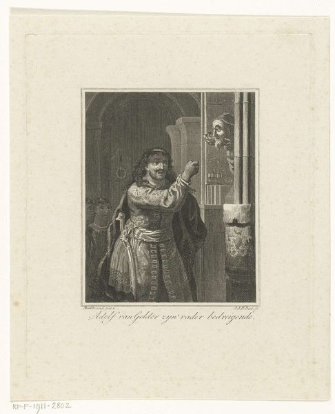 Philippus Velijn created this print, "Simson zijn schoonvader bedreigend," capturing a tense moment rooted in biblical narrative. The raised fist, a universal symbol of defiance and anger, dominates the composition. It’s a gesture that transcends time, echoing in ancient Roman battle reliefs and resurfacing in Renaissance depictions of biblical battles. Consider the clenched hand—it’s a primal expression of frustration and rage, a release of inner turmoil. Think back to Michelangelo's David, poised with a similar tension, ready to strike. Here, Velijn taps into that same well of human emotion, drawing on our collective understanding of power and conflict. This non-linear progression shows us how the same symbol evolves and resurfaces, taking on new meanings, yet still resonating with primal emotional force.