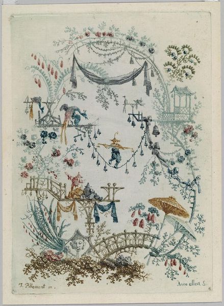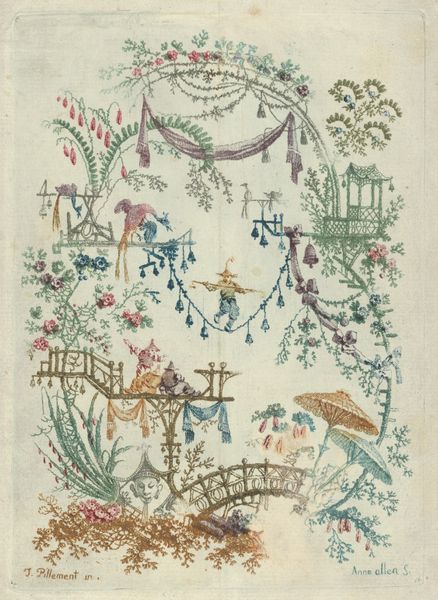 Curator: This delicate drawing is titled "Design sketch in Chinoiserie style" and is attributed to Abraham van Strij, dating sometime between 1763 and 1826. The piece uses watercolor and drawing media. What's your immediate impression? Editor: It's ethereal. The pale palette and meticulous linework evoke a sense of refined fantasy, a sort of dreamlike tableau. It has a gentle lightness of being that feels very comforting. Curator: Indeed. The use of Chinoiserie immediately suggests a Western fascination with the East, specifically China, popular during the Rococo period. Notice the tent-like structure in the central panel, with figures adorned in what would be considered vaguely “oriental” garb at the time. Editor: Absolutely, and consider the symbolism of the birds. Suspended in cages and flanking either side of the scene, these creatures have long represented confinement and unattainable dreams. Are they reflections of societal constraints imposed during the period or purely ornamental motifs of a fanciful style? Curator: Good question! But let’s also analyze the structural repetition—the way elements like floral swags and decorative vases are mirrored within each vertical panel. This introduces a structured symmetry. Editor: While visually engaging, this constructed balance also implies a fabricated view of the Orient. The scene is curated, tamed. It's an arrangement meant to delight rather than enlighten. Note, even the single, stylized palm curls artificially overhead, as if part of the scenography. Curator: A vital observation! The pastel palette too contributes, almost homogenizing diverse forms into a wash of pleasing harmony, which emphasizes surface decoration above detailed symbolic communication. It’s design intended to evoke mood rather than convey complex narratives. Editor: Perhaps. It leaves one considering the legacy of art, its relationship to culture, and our shared longing to comprehend people beyond geographical divides—whether achieved through actual dialogue or ornamental symbolism. Curator: Yes, this design really makes us wonder whether our visual pleasures reinforce or complicate our understanding of other cultures. Thank you.