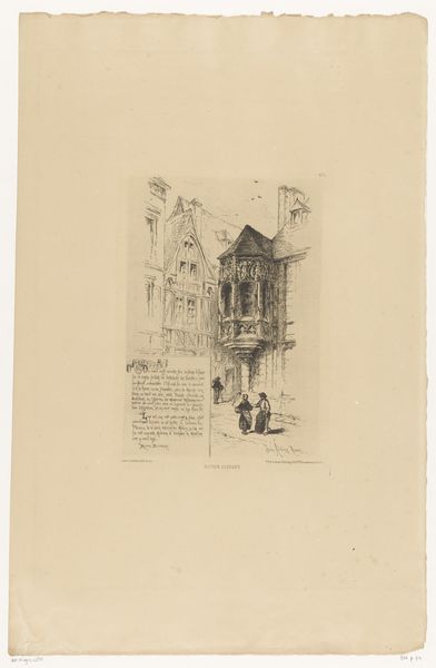 Adolphe Rouargue's lithograph, "Stadsgezicht op Sint-Winoksbergen," captures a street view with striking clarity. The composition is dominated by the towering belfry, a vertical thrust that anchors the scene. The artist uses hatching and cross-hatching to define forms and create tonal variations, giving depth to the buildings and figures. Notice the linear precision in the architectural details versus the more fluid rendering of the people and animals, this contrast enlivens the street. The placement of the belfry centrally, framed by the receding street, draws the eye upwards, suggesting a hierarchy of urban life, where architecture symbolizes permanence and order. The townspeople in the foreground provide a human counterpoint, their activities rendered with a gentle touch. Rouargue’s lithograph uses its formal structure to present Bergues as a place where civic identity and daily life are intertwined. This artwork is less about a literal depiction and more about an arrangement of lines and forms that evoke a sense of place.