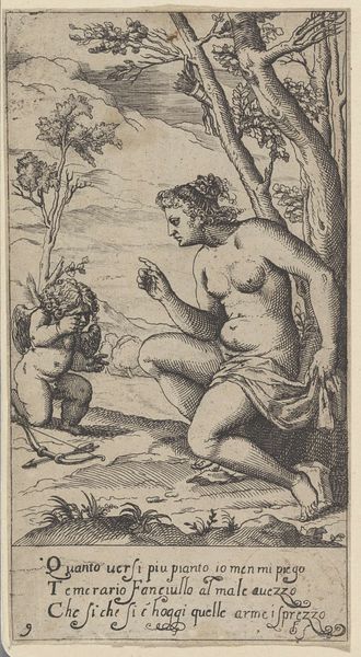 Curator: This image, simply titled "Venus Kust Amor," dates back to the period after 1617. Created by an anonymous hand, this engraving on paper currently resides within the Rijksmuseum collection. What’s your first take? Editor: Intimate, but slightly…strained? The embrace feels less tender and more like a power dynamic is at play. And that Mannerist style! Everyone's a little too elongated and elegant. Curator: It’s a compelling piece for examining erotic themes and the pervasive allegories of the period. Venus and Cupid locked in a kiss… Yet the text at the bottom complicates the interpretation, suggesting perhaps, less affection and more "mortal foco"— deadly fire. Editor: Ah, yes! Let's look closer at this cultural moment: 17th century society viewed such imagery with distinct socio-political lens. Erotic art, though often subtly veiled in mythological context, played into ideas about power, social control and the visual representation of societal ideals or aspirations. Curator: Precisely. Cupid is vulnerable in Venus’ grasp. The image certainly utilizes nudity, typical for such renderings of classical subjects. However, it is that very combination that speaks to a continuity in our visual vocabulary - exploring the psychological undercurrents between mother and child or dominance versus dependence. Editor: Do you see any evidence to this political climate within its lines? Does this reveal a particular statement for their society's norms? Curator: Consider how images like these, circulated through prints, subtly shaped perceptions of authority. The artist employs allegory—Venus embodies ideals, amor/Cupid emotions—implying forces govern our behaviours. It's an ideology. Editor: What truly marks the work’s longevity and continuous hold on popular imagination are not only the symbolic roles Venus and Cupid assume as visual prompts, but how cultural interpretations surrounding the work vary over time in keeping pace with the ever changing role for public imagery! Curator: You are right, from the artistic mastery of the engraver to the socio-cultural context and beyond, we gain insight not only into artistic norms from ages past, but human emotional patterns and psychological depth we have been consistently grappling with across cultures and through time. Editor: A visual embodiment that persists and changes throughout our human tale. Very enlightening.