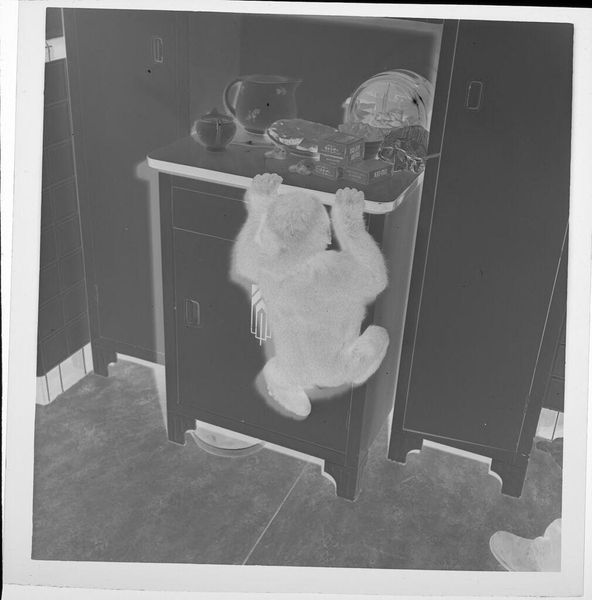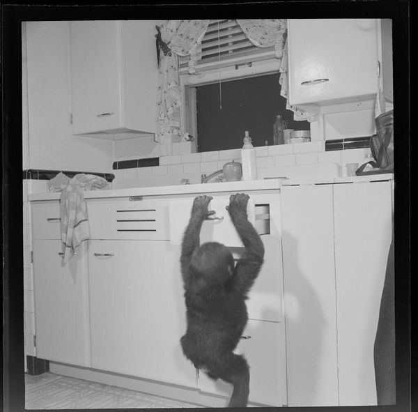 Curator: This photograph by Jack Gould, simply titled "Untitled (baby gorilla climbing on cabinets)," presents us with a curious inversion of domestic space. Editor: My first thought is how unsettling the image is. The stark contrasts and unexpected subject create a surreal, almost dreamlike quality. Curator: Indeed, the juxtaposition of the gorilla, a symbol of untamed nature, against the backdrop of the mundane, the kitchen, highlights a long history of colonialist practices of capturing wild animals and placing them into domestic settings. Editor: The act of climbing itself is potent—a symbol of aspiration, but also transgression, suggesting a disruption of the established order. Is the gorilla trying to escape, or simply explore? Curator: I think Gould invites us to reflect on the power dynamics embedded within such spaces, the very nature of what we consider wild and tame. Editor: Yes, and how those images, endlessly repeated, shape our understanding of our relationship with the natural world. It is jarring and effective. Curator: A disquieting image, certainly, offering a glimpse into the tangled web of our cultural attitudes. Editor: A symbolic encounter, frozen in time, inviting us to question the boundaries we construct.