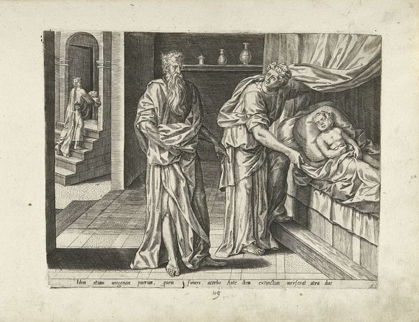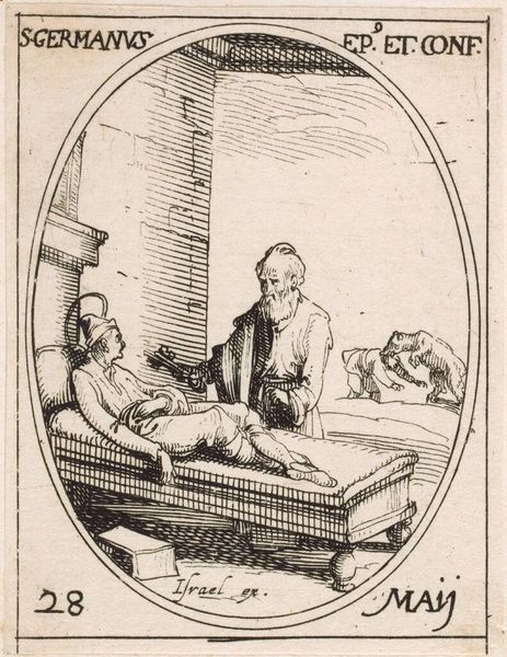 Curator: Immediately, I'm struck by the image's quiet dignity. There's a somberness, a solemnity, despite its small size. Editor: This is Jacques Callot’s "Saint Margaret of Scotland." Callot, who lived from 1592 to 1635, was a master of the etching needle, and this work exemplifies his delicate precision. Curator: The composition feels almost theatrical. The saint seems to stand apart, yet connected by gesture to the figures on the bed. What does she represent in this domestic scene? Editor: Margaret was known for her piety and charity. Her presence here, tending to the sick and poor, reinforces her image as a compassionate queen, a pillar of strength and faith within her realm. Curator: It’s fascinating how Callot uses line to evoke both physical form and spiritual qualities. It is like the halo is as solid as the walking stick. Editor: Absolutely. This print reflects not just a historical figure, but also the enduring power of images to shape public perception and inspire devotion. Curator: A beautiful miniature that speaks volumes about faith, duty, and the role of women in history. Editor: Indeed, a testament to how carefully crafted imagery can build lasting cultural narratives.