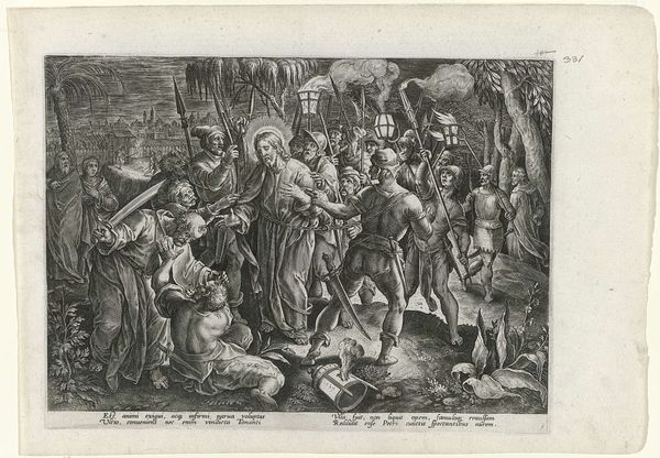 Bartholomeus Willemsz. Dolendo created this print of the crowded Mount Calvary, using etching techniques. The composition is divided into clear zones with a foreground full of figures, leading the eye towards the central execution scene and then back to a distant city. Dolendo masterfully uses line and hatching to create a sense of depth, texture, and tonal variation, despite working in monochrome. The density of the crowd, depicted with varied poses and expressions, conveys a sense of chaos and emotional intensity. The horizon line places the viewer above the action, akin to overlooking a stage, and this constructs a narrative space that invites close inspection. The artwork is less about the singularity of Christ’s sacrifice and more a study of human reactions. The lines and shading emphasize the overwhelming scene and challenge any singular interpretation of the crucifixion story.