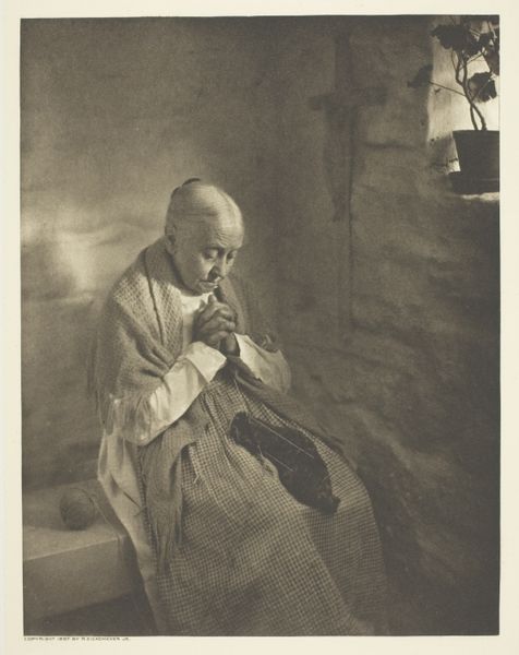 Alfred Stieglitz captured this intimate portrait of Katherine Herzig using gelatin silver print, a process that democratized photography in the late 19th century. The tonal range achieved through this method lends the image its melancholic, soft focus. Herzig’s direct gaze, combined with the tangible textures of her knitted cardigan and gathered wildflowers, speak of the everyday. Photography, at this time, was in transition, claiming its place as fine art, while its roots remained firmly planted in mass production. Stieglitz’s choice to portray Herzig in such a candid, almost domestic light, blurs the boundaries between the personal and the public, the artistic and the mundane. It invites us to consider the labor and social context embedded in even the simplest of images, and how the photographic process itself can elevate the ordinary to the extraordinary.