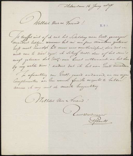 Curator: Today we’re looking at Carel Jacobus Behr’s “Brief aan Johannes Jacobus Franciscus Wap,” likely dating from between 1840 and 1846. It’s rendered in ink on paper, a delicate drawing in the romantic style. Editor: The first thing that strikes me is the vulnerability in the handwriting. It seems a bit faded and shaky. Curator: Precisely. We can see in the paper itself, particularly its slight discoloration and creases, evidence of the document's journey through time and its materiality. It suggests a private, intimate history, meant only for its recipient. Editor: A small, everyday interaction rendered permanent! Ink, paper, words... all charged with a sort of desperate longing or a vital request. Does this fall under a tradition of personal correspondence elevated to art? Curator: One could certainly view it through that lens, examining the social function of letter writing during the period and Behr's potential elevation of a common practice. The drawing style relates directly to genre paintings prevalent during that era. It depicts a scene from everyday life. Editor: Genre! Ah, but does it offer a commentary on class, on literacy? The elegant, swirling script…was Behr perhaps romanticizing the act of communication itself, making a statement on accessibility, perhaps? Curator: Those are valid angles for investigation, especially when we think of consumption and the value placed on tangible media versus fleeting, oral forms of communication among varied populations in that moment in history. It's intriguing to consider, how a letter bridges distances physically but might simultaneously reveal social distances. Editor: Thinking of distance, the texture suggests an immediacy… a wish to transport thought as quickly and intact as possible! I imagine how fragile such documents become. Each smudge a ghost of touch, each faded word, a whisper of lost urgency. It's poignant to hold this idea in your mind, I think. Curator: Yes, indeed, from analyzing its chemical traces to studying the labour inherent in its manual creation, there is an ocean of cultural and historical value preserved in Behr’s "Brief aan Johannes Jacobus Franciscus Wap." Editor: Definitely! It has been an insightdul experience. Thanks to you for opening up these perspectives and thoughts.