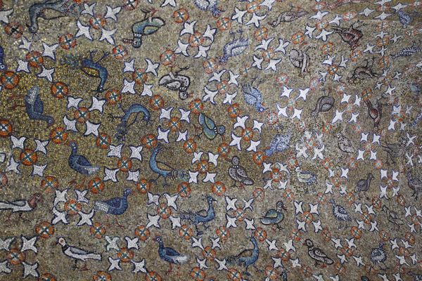 Curator: What a mesmerizing deep blue! It gives the impression of floating in space, gazing up at distant stars. Editor: That's an apt description of the mosaic ceiling we are observing within the Mausoleum of Galla Placidia, located in Ravenna, Italy. Dating back to about 425 AD, this stunning work represents early Byzantine artistry. Curator: The context of the mausoleum itself adds layers to this stellar pattern. It was commissioned by a woman of incredible power, Galla Placidia, who was a Roman Empress. What can you say about that kind of a statement on identity and power, realized in glittering mosaic tesserae? Editor: Power and identity are clearly communicated here but so are sophistication, balance, and hierarchy through visual syntax. I am seeing how the concentric circles draw the eye and provide visual focus. There's something almost hypnotic in the ordered repetition. The contrasting warm colors, like the rust and gold, keep it from feeling too cold or distant, and activate the space between elements. It is very considered, as is the subtle texture made by the hand-laid tesserae that comprise this gorgeous ceiling. Curator: Absolutely. We must consider Galla Placidia's role as regent during a turbulent time, her influence extending over both the Western and Eastern Roman empires. How she claimed and wielded authority, at a time when powerful women were frequently written out of history. And so the use of deep blues could symbolize the imperial might of Byzantium, drawing from both pagan and Christian iconographies in complex and nuanced ways. What might it say to install this geometric schema above one's entombed body? Editor: Perhaps the repetitive visual language invites contemplation on more abstract concepts. Looking closely at the geometric organization here allows me to imagine how different interpretive strategies may emerge in viewers, while being respectful of a time that produced art to embody concepts, ideals, beliefs and/or, most fundamentally, optical truth and balance. Curator: Viewing the mosaic not as merely decorative, but as an ideological text reflecting broader sociopolitical forces makes this small structure, almost otherworldly. Its impact goes beyond the visual delight in its chromatic richness. Editor: I find it remarkable how the material itself elevates our engagement; each tiny piece painstakingly placed. Such intentionality elevates its significance and suggests the careful deliberation behind this commission.