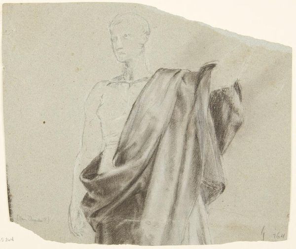 Curator: I’m drawn to the dreamy, almost ethereal quality of Domenico Morelli’s 1879 print, “Personification of Engraving.” It’s rendered using etching and engraving techniques. What are your first impressions? Editor: It feels intimate, like a half-remembered dream. The figure seems to emerge from the shadows. I love the way the light catches her face, but everything else is quite hazy. What’s she actually holding? It's intriguing. Curator: Indeed. It's understood she’s an allegorical figure—the embodiment of the very act of engraving. We see her poised with the tools of her trade. Consider the position of women and labor during this era. Was this simply a symbolic embrace or something deeper? The art world and craft traditions often intersect with class and gender. Editor: That’s such an interesting point! So, the instrument she's holding symbolizes...art itself, a power of creation available at least conceptually to all, not just men. There's also a slight melancholy about her. Is she weary of creation, or maybe questioning it? Curator: I read the melancholy as a product of the historical context in which Morelli lived and worked, the unification of Italy was unfolding, and that created great upheavals. Her pensiveness echoes an ambivalence regarding progress and the future of the nation. Her presence reminds us that every image, every act of creation, is intertwined with the complexities of history. Editor: That's deep. It makes me want to go find my own etching tools...or maybe just go find a really good pen and draw. This almost feels like permission to just let whatever happens, happen on the page. Curator: I appreciate that reflection. This piece shows us how an image, however small and seemingly simple, can invite conversations about craftsmanship, identity, and the narratives we choose to represent, and that linger far beyond its creation. Editor: Totally. And maybe that melancholy is just a reminder that art is work too—beautiful, difficult, world-shaping work! Thanks for pulling me into the historical threads. I see it so differently now.