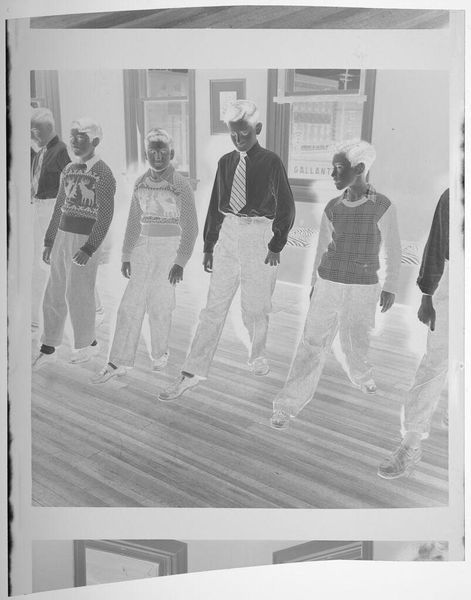 Curator: This is an untitled photograph by Jack Gould, currently residing here at the Harvard Art Museums. It depicts several boys sitting on wooden benches. Editor: The first thing that strikes me is this slightly unsettling, almost spectral quality. The inverted tones give it a ghostly feel, like a faded memory. Curator: Indeed. The photographic negative invites contemplation on themes of youth, collective identity, and perhaps even a commentary on social dynamics. I wonder about the context in which it was taken. Editor: Yeah, there's a sense of waiting here, a quiet tension. It almost feels staged, yet there's a raw, unpolished edge to it. Curator: Precisely. The composition emphasizes the boys' expressions and postures, hinting at a deeper narrative involving power, conformity, and societal expectations. Editor: For me, it's a reminder that even seemingly simple images can hold a universe of unspoken stories. Like, what are they all waiting for? It sparks curiosity, you know? Curator: Absolutely. It encourages us to think critically about the representation of youth and the subtle complexities of group dynamics within a historical framework.