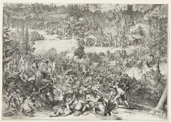 This etching, dating to 1674, by an anonymous artist depicts ‘The Capture of Prince Wilhelm von Fürstenberg.’ Immediately, one is struck by the chaotic composition, where the eye is drawn into a flurry of dark lines. A battle scene unfolds with a carriage overturned amidst a skirmish, contrasting with the architectural order of the town in the background. The artist's use of line and form creates a sense of dynamism. Note how the artist uses the contrast of light and shadow. Through hatching techniques the work evokes the drama of the event but also hints at the political tensions of the period. The scene functions as both a literal depiction and a symbolic representation of power, authority and the disruption of order. Consider how the formal qualities of the print—its lines, composition, and attention to texture—invite us to contemplate not just the event itself but the broader themes of conflict and authority.