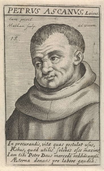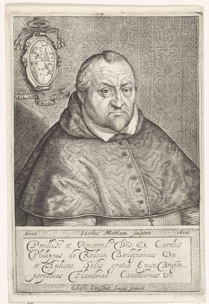 Curator: Here we have Jacob Matham's "Portrait of H. Leonard Vechel," dating back to 1617-1618, currently housed in the Rijksmuseum. It's an engraving, so we’re dealing with a very specific kind of reproductive printmaking here. Editor: It has an impressive and dignified gravity; there's a solidity to him that the black and white etching somehow amplifies. The gaze is steady. Curator: The materials of the engraving themselves—the metal plate, the acid, the paper—were tools of democratization. Matham made a career of making images accessible to a wider public. Think about it: one person's likeness replicated potentially hundreds, even thousands of times, circulating within the culture. Editor: Precisely. Prints like these were vital for propagating images of important figures. It's not just an individual likeness, it's contributing to his public image, to the persona he embodies for his followers, congregants. It solidified Vechel’s authority. And consider how that circulated within a religious and political context of the time. Curator: Definitely. And look at the texture that Matham achieves with the engraving; it almost mimics the fabrics of Vechel’s garments, especially the elaborate pattern in his vestments. This hints at the wealth and prestige attached to his position. What's being worn becomes just as much of a visual signal as the face. Editor: You know, seeing his vestments so carefully depicted does make me wonder about the intended audience and how they might read this. The very deliberate choices in presentation—everything down to the Latin inscription beneath the portrait, signaling education and sophistication. Curator: Agreed, every element contributed to a carefully constructed message. Considering the cultural role engravings played at that time truly reveals how art can become a tool for influence. Editor: This was not just an image; it's a statement. An assertion of presence and power within the society of the time. The intersection of individual and the institution, solidified in ink. Curator: Examining how the work was materially produced changes the way we value the final print and the image itself, especially how the accessibility of prints influences public perceptions of authority figures such as Vechel. Editor: Absolutely. Considering its social role enhances its artistic importance today, shedding new light on societal hierarchies.