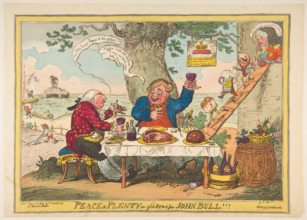 Curator: Before us, we have "The Plumb-Pudding in Danger;–or–State Epicures Taking un Petit Souper", a hand-colored etching by James Gillray created around 1805. Editor: The immediacy is striking. The cartoonish exaggeration throws the power dynamics into sharp relief. I can almost feel the tension, like a twisted comedy about to unfold. Curator: Look at the tools they're using – a carving knife versus a dainty fork. England's Pitt has the knife to carve out the Ocean for himself while France’s Napoleon uses his sword to cut into Europe. The artist really drives home the message of greed and control with these choices. Editor: Exactly. Consider plum pudding itself – its rich, high calorie recipe was costly for many at the time, a luxury. Here, Gillray depicts England and France attempting to devour the entire world, but only those with such insatiable and unnatural desires would wish to partake in such gluttony, highlighting an era marked by both nationalistic ambitions and access. What’s really fascinating is how the act of consumption is transformed into political theater. Curator: I’m also struck by the date; 1805, a turbulent time of expansion. He’s using very particular, and reproducible medium to target as many people as possible. Think about it: what other choice than etching to rapidly spread such visual information so publicly, so quickly, among the English populace? Editor: That speaks to the power of images to shape and solidify these historical actors into cultural symbols. Pitt’s thin, severe face and Napoleon’s sideways glare - they're not just political figures; they're figures of legend. The image is deeply embedded in a symbolic tradition. Curator: I see it more as a snapshot of the processes of empire – the tools, the greed, and the material realities underpinning territorial conquest – presented for mass consumption as if the populace is supposed to accept what has happened without their own input. It makes me reflect on the artist’s agency here: what part did he wish to play in this social theater? Editor: Whether critic or propagandist, Gillray's focus on potent visual language helped to shape our understanding of power itself and gave future generations new material to think with, didn’t it? Curator: Absolutely. The etching allows us to revisit not only the past but to reconsider the power and labor inherent in printmaking at a pivotal moment in history.