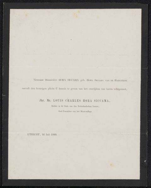 Curator: What strikes me immediately is the weight of history, you know? This muted colour palette, the aged paper itself...it feels like holding a tangible piece of the past. Editor: That's exactly right. We're looking at a piece entitled "Overlijdensbericht betreffende Willem Linnig (I)," which translates to "Obituary Notice Concerning Willem Linnig (I)." It's believed to be from around 1885 to 1888. It's typography on paper. Curator: An obituary, huh? No wonder there’s this sense of quietude. It's stark and composed, but behind the historical font, I almost feel like Linnig himself had a hand in its making—a last gesture, shaping his own narrative for posterity. A bit romantic, I know, but can't you feel that? Editor: It’s compelling to consider the agency involved in crafting this public declaration. Willem Linnig was an artist himself, so this wasn't just a document, but a deliberate construction. The columned text, the carefully chosen font—all these elements speak to the social conventions of the time. Think of the intended audience, the social circles, how news of death was circulated and received. Curator: There's almost something beautiful in it, even amidst the sadness. The family members listed at the top... like a tapestry, each name is a thread contributing to the larger design, wouldn't you say? And this reminds us of art's unique place within our traditions to create a shared narrative and collective experience, even in moments of profound loss. Editor: I agree. What this reveals is not simply a record of death, but an insight into the performance of mourning and how these printed notices reinforced social bonds. Each detail signifies an aspect of societal customs and structures around grief during that period. Curator: So true. Thank you. Holding onto that... the blend of personal grief within this framework of community acknowledgement... it certainly encourages one to reflect on the rituals we observe to honor the passing of creatives in the present, doesn't it? Editor: Indeed. It really underlines how deeply entwined art, society, and historical practices can be.