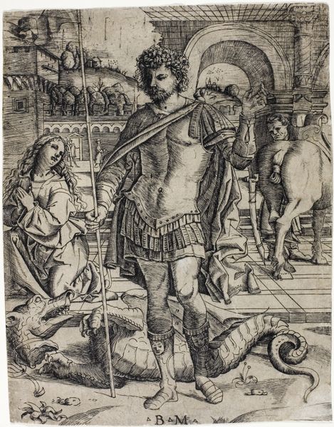 Benedetto Montagna created this engraving of Saint George in Italy in the late 15th or early 16th century. The subject, a legendary Christian martyr, was especially popular in the Veneto at this time. The image, though Christian in theme, draws heavily on the visual vocabulary of ancient Greece and Rome. We can see this in the classical architecture that frames the scene, the idealized physique of the Saint, and the faces on his armor. The choice of Saint George as a subject may reflect local religious sentiments but, as an engraving, its real cultural work happened as it was bought and sold in the art market. Prints like this one democratized image production by making art available to a wider audience. Historical research, like that into print markets, helps us understand the social conditions that shaped the meaning and production of art at this time.